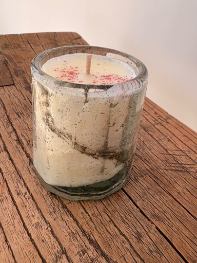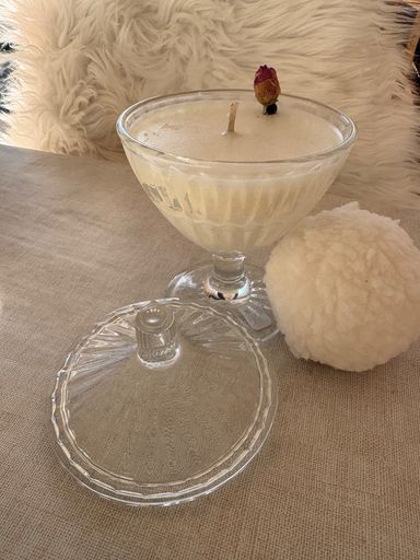 Dans un contenant proposé à l'atelier, Sylvie a choisi une fragrance Bois d'olivier , de petites fleurs séchées ont sublimé la bougie