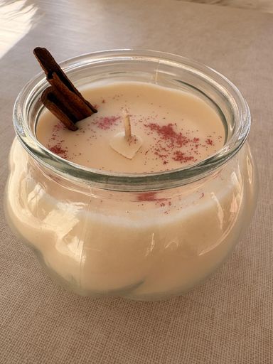 Dans un contenant de l'atelier , bougie parfumée à la Pomme Cannelle