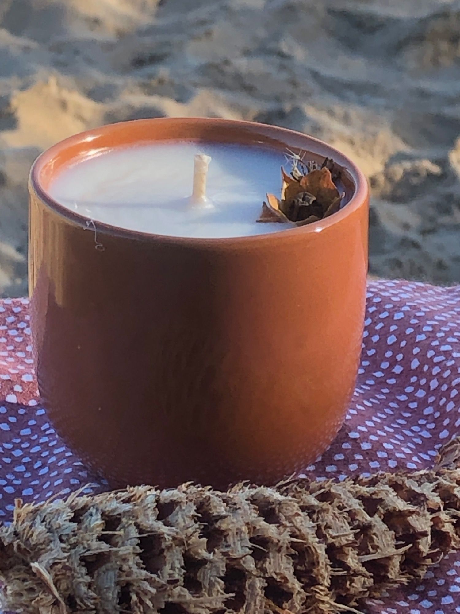 Dans un magnifique contenant apporté par Mme L, bougie parfumée au Caramel Beurre salé !